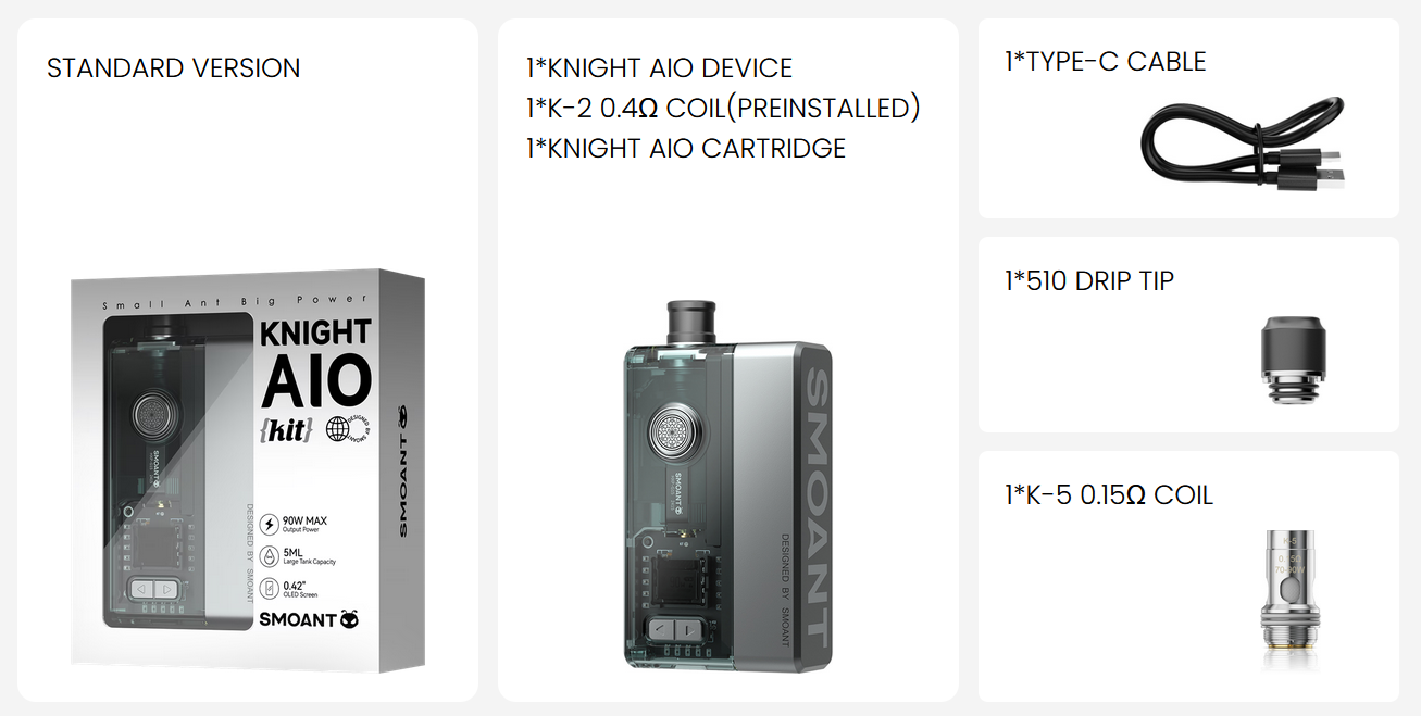 С емкостью картриджа 5.0 мл, Smoant Knight AIO позволяет вам наслаждаться длительными сеансами без частой замены жидкости. Используйте испарители серии K для оптимального вкуса и насыщенности. А так же присутствует поддержка сторонних BORO-танков и 510 дриптипов.